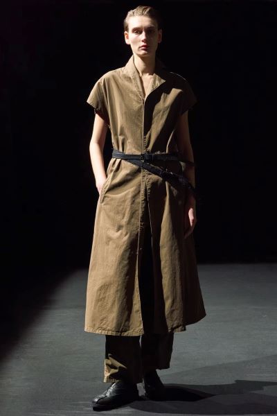 構築的で強いシルエット。ベージュ・カーキ などの無骨な色──「強い」要素と、対比する繊細なベルベットや動きのある素材感が持つ洗練 された雰囲気を織り交ぜ、バランスを探る。