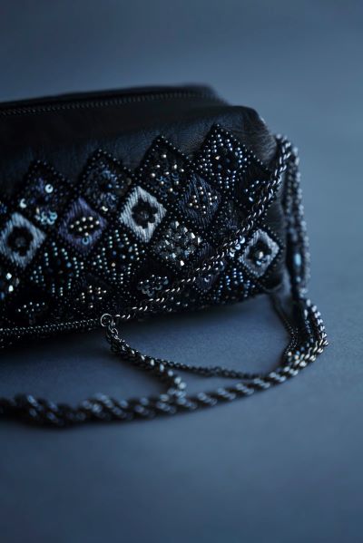 上質なレザーを使用し、新たに登場したモダンなシルエットのショルダーバッグ「POLYHEDRON」。ミニポーチやカードケースがついたビーズ&チェーンのバッグチャームと、インド刺繍によるショルダーストラップを組み合わせた特別仕様です。