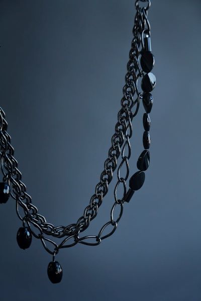 深い輝きを放つ小さなブラックストーンを、キーチェーンのアクセサリーと組み合わせて仕立てた、ジュエリーのような繊細さを携えるチャーム付きショルダーベルト。