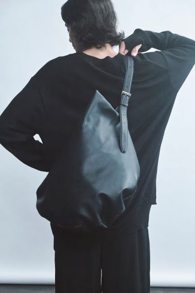 口元が非対称なかぶせで覆われた「VEIL」。見た目の印象と比較しボディの容量が大きいため、太めのショルダーがデザインされ、肩への負担を減らすように設計された機能的なデザイン。