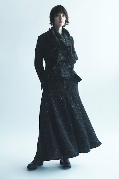 POP-UP STOREでは、ショーピースから着想を得た、白と黒のコントラストが際立つツイード素材のセットアップや、キルティング加工により温もりと柔らかさを兼ね備えたコートなどを展開しています。