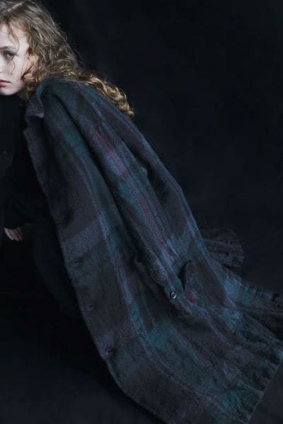 中番手のウールを使用した緑や青のチェック柄ジャケットやコートは、深みのある風合いと柔らかさが調和し、洗練されたY’sの世界観を感じさせます。