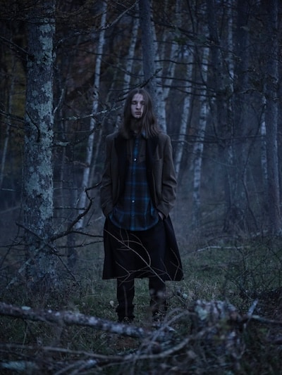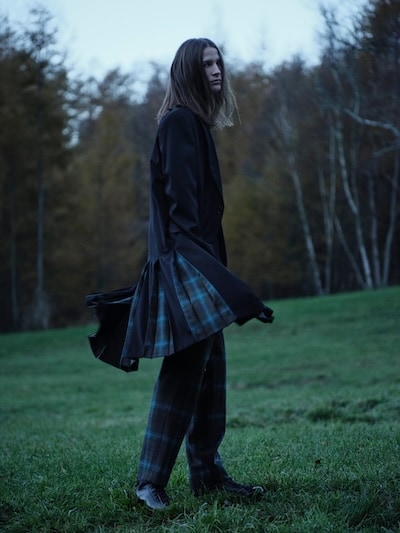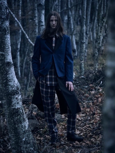 本コレクションでは、Yohji Yamamoto POUR HOMME 2008-09AWランウェイに登場したチェック柄アイテムを再構築し、ジャケット、シャツ、パンツを展開します。ブランケットのように贅沢にチェック生地を用いた分量感のあるストールジャケットや、レイヤード構造のジャケット、プリーツ部分にチェック生地を縫い込んだジャケットなど、ロング丈のジャケットに細身シルエットのパンツを組み合わせています。希少なUSメイドのペンドルトンチェック生地のオーセンティックで温かみのある表情を、ヨウジヤマモトならではのシルエットやデザインと組み合わせ、新たなスタイルとして提示します。