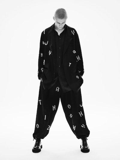 本コレクションでは、トラッカー型デニムジャケットに手作業によるスタッズワークで“YOHJI”の文字を表現。また、ウールギャバジン素材のジャケットとパンツによるセットアップにもHTCの装飾加工を施し、1点のみのエクスクルーシブアイテムとして制作しています。熟練職人の手作業によって生まれる個体差や温かみのある表情が魅力です。また、スタッズショルダーバッグ、スタッズベルト、スタッズブレスレットなどのアクセサリーも展開しており、ヨウジヤマモトのデザインとHTCの職人技が融合した特別なラインアップとなっています。