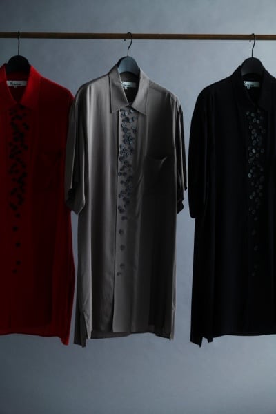 前身頃に多数の釦を配した半袖シャツは、光沢としなやかなドレープ性のある表情を備える。釦は単なる装飾にとどまらず、留め方や開き具合によってシルエットや表情に変化をもたらす。