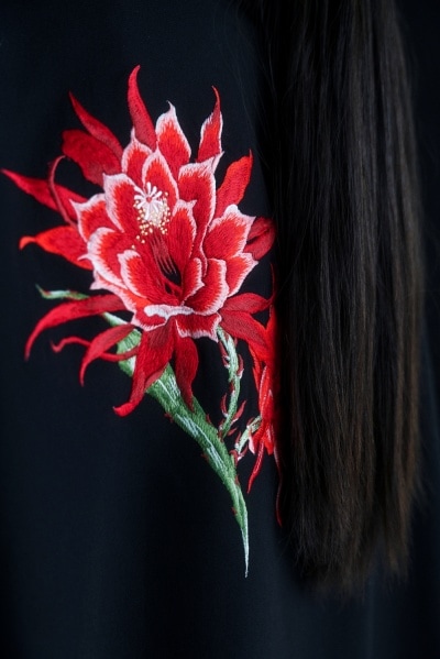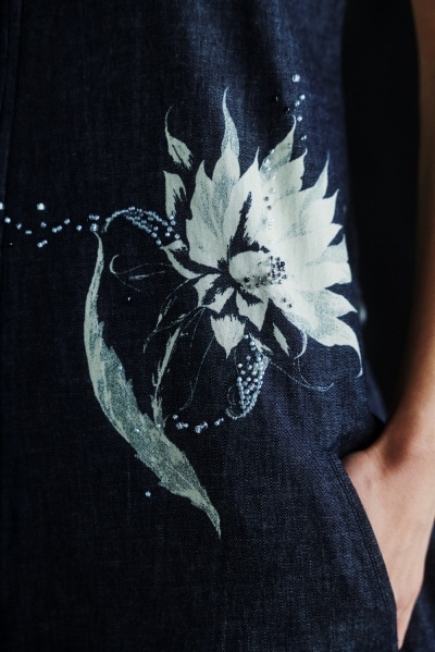 デニム生地にサボテンの花を抜染プリントし、柄に合わせてビーズが散らばるように刺繍を施した。